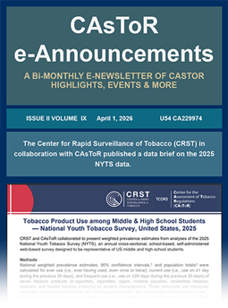 - A bi-monthly e-newsletter of CAsToR highlights, events and more. Headlines: The Center for Rapid Surveillance of Tobacco (CRST) in collaboration with CAsToR published a data brief on the 2025 NYTS data. • RFA for scholarships: Summer Course on Tobacco Simulation Modeling • Workshops: “Forecasting the Impact of a U.S. Nicotine Reduction Standard on People with Disabilities” with Dana Rubenstein, MD, MHS and “Crafting Public Comments for Proposed Tobacco & Nicotine Rules” with Dr. Holly Jarman